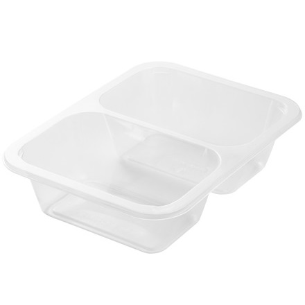 Прозрачный пищевой контейнер под запайку, состоящий из двух секций, идеально подходит для упаковки различных продуктов питания. Он изготовлен из материала, который выдерживает температурные диапазоны от -15°C до +116°C. Это делает его универсальным контейнером для упаковки как для горячих, так и для холодных блюд.