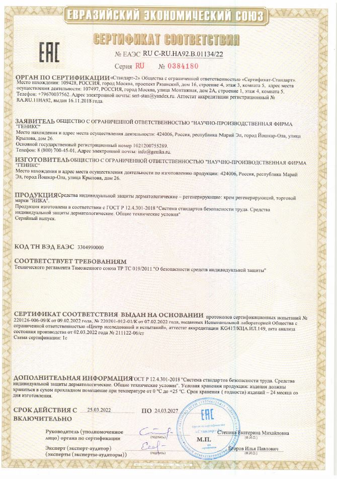 Крем питает и восстанавливает кожу, защищает ее от неблагоприятного воздействия негативных факторов (в том числе производственных и окружающей среды): раздражающего действия химических веществ, пониженных температур, частого мытья, ветра, снега и др.