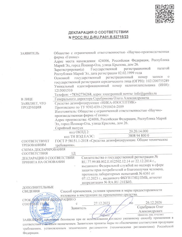 Средство дезинфицирующее 1,0 л "Ника-Изосептик" (1/12 шт.) ЧестныйЗнак