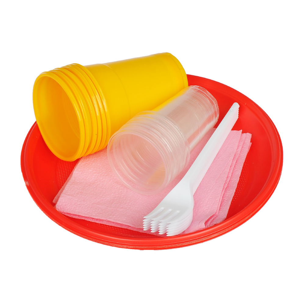 Набор для пикника - это решение для тех, кто ценит удобство и комфорт во время отдыха на природе. Этот набор включает в себя все необходимое для организации пикника: тарелка d-205 мм 6 шт., вилка 6 шт., стакан 100 мл 6 шт., стакан 200 мл 6 шт., салфетка (1 сл.) 6 шт.
